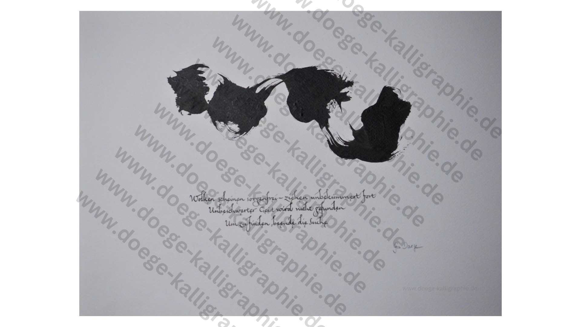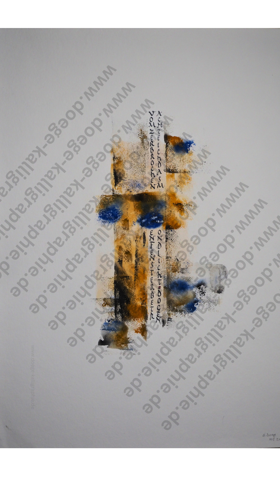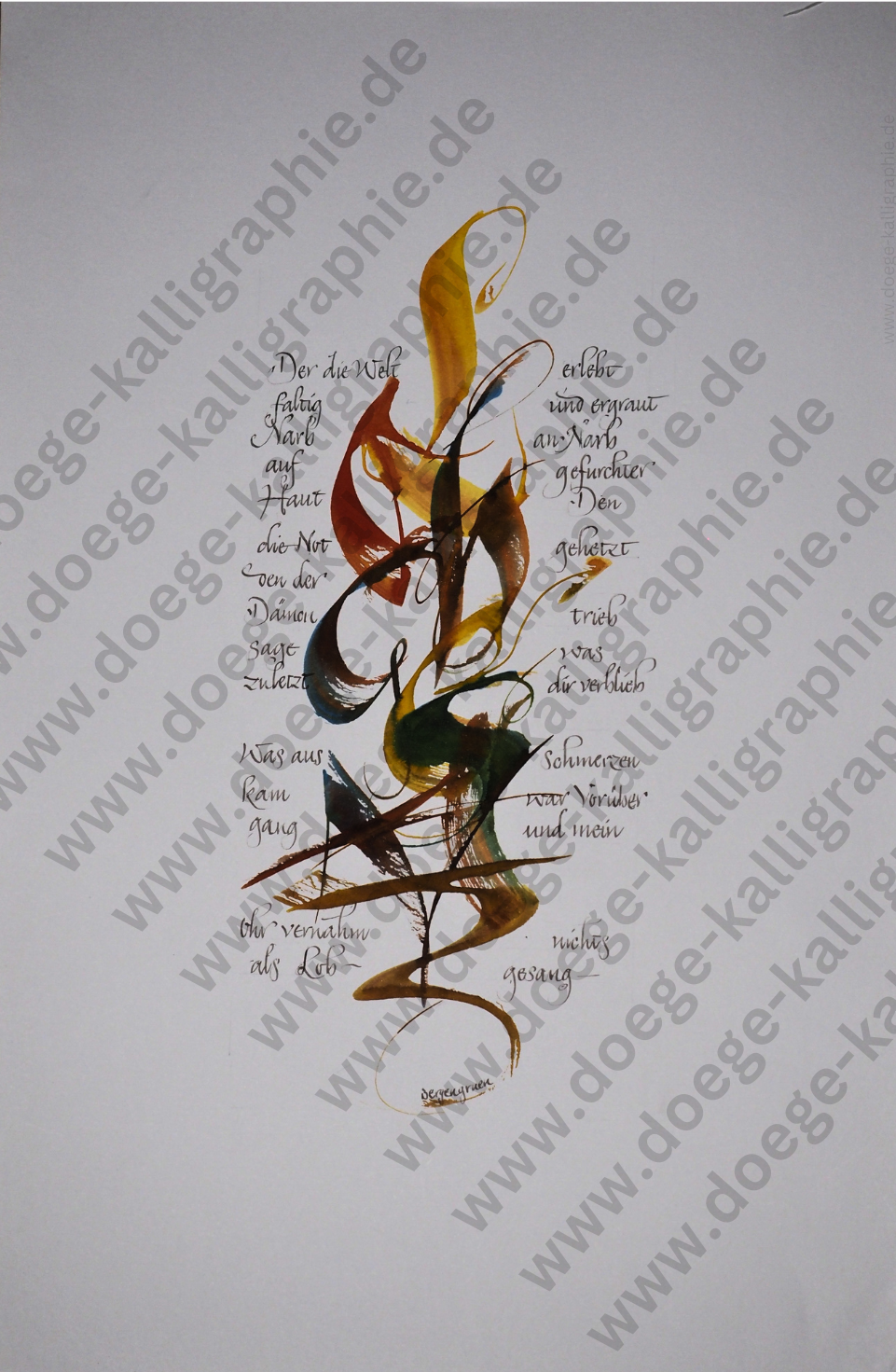 Die kalligraphischen Arbeiten von Gerd Doege wollen Texte sichtbar machen: Texte quer durch alle Kulturen, in denen die Kunst des schönen Schreibens gepflegt wird. Texte allerdings, die nicht durch bloße Aneignung von Darstellungsweisen lebendig werden, denen sie ihrer Tradition nach entstammen, sondern im Zusammenstoß mit anderen Traditionen.